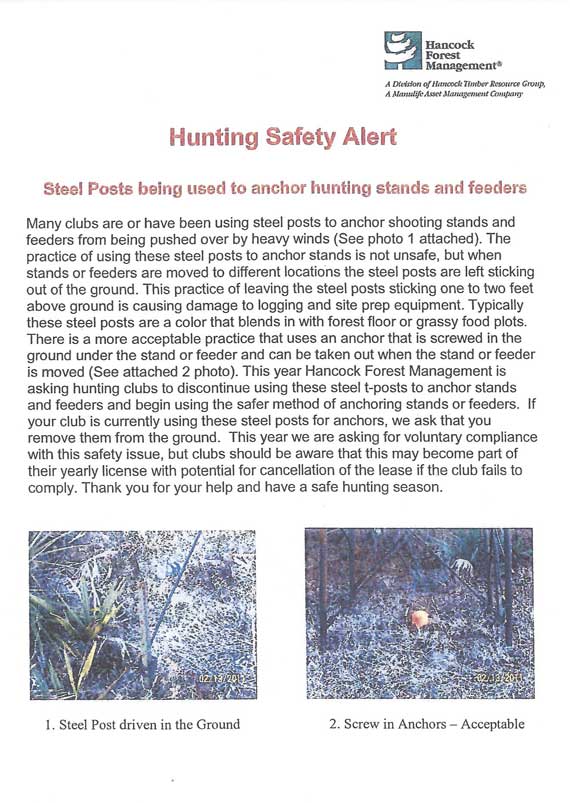 Any stand or feeder that not marked with a club member's name and phone number will assumed to be the property of a former member or trespasser, unmarked stands will be removed.